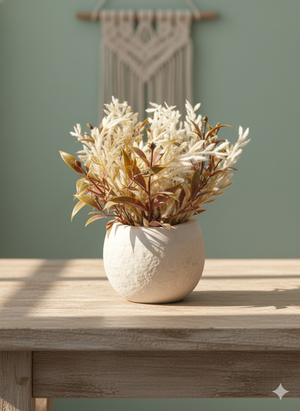 Add warmth and elegance to your space with this Beige Textured Ceramic Planter featuring Artificial Brown-Green Leaves and Soft Cream Sprigs. Designed to bring a soothing, natural touch to modern interiors, this piece beautifully blends earthy tones with a contemporary aesthetic. The handcrafted ceramic pot, finished in a subtle beige hue with a natural textured surface, perfectly complements the delicate foliage arrangement above.