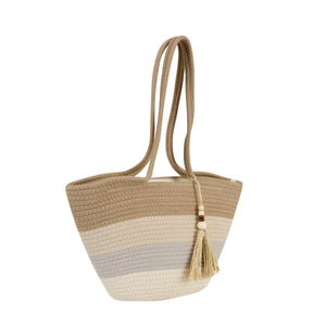 This Beige & Grey Cotton Woven Tote Bag is a chic and eco-friendly accessory designed for women who value both elegance and practicality. Handcrafted from premium cotton, it features a calming four-tone palette of beige, grey, cream, and white for a versatile, sophisticated look. A decorative cotton tassel with wooden bead accents adds a touch of bohemian charm, making it an ideal choice for casual outings, shopping, beach trips, or travel.