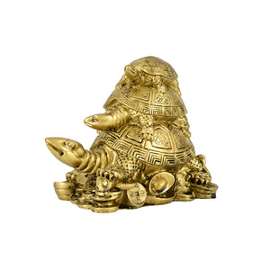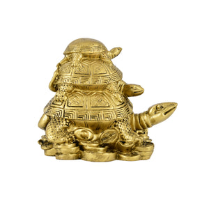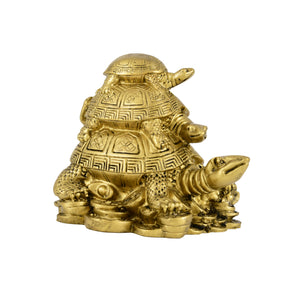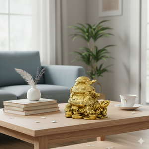 This Golden Feng Shui Triple Tortoise Statue is a powerful symbol of protection, stability, and long life. Featuring three tortoises stacked together, it represents strong family bonds, harmony, and generational blessings. The tortoises rest on a bed of coins and ingots, making it a symbol of both wealth and longevity.