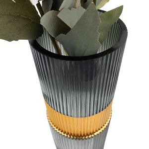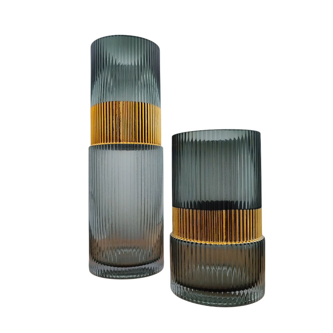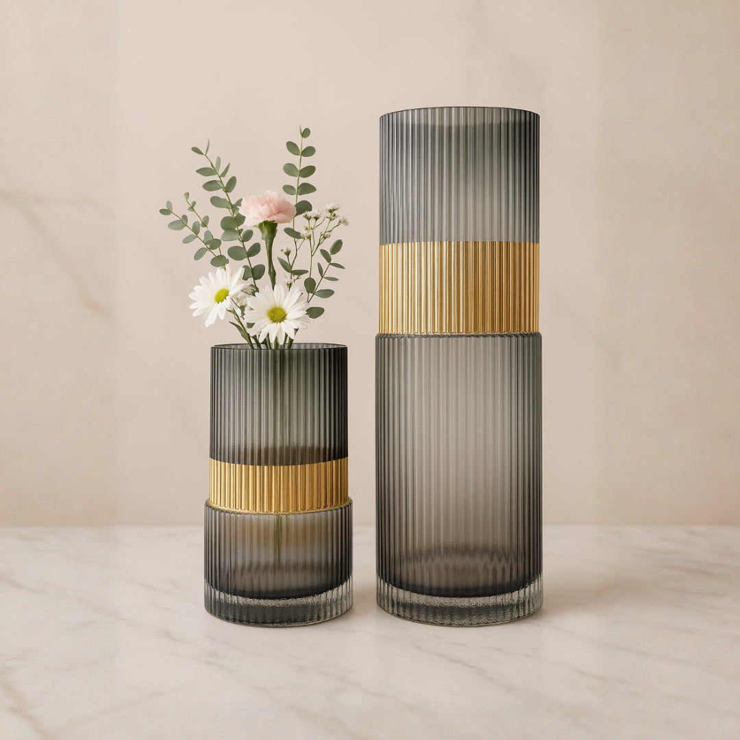 Smoky Grey Ribbed Glass Vase Set with Gold Accent (Set of 2)