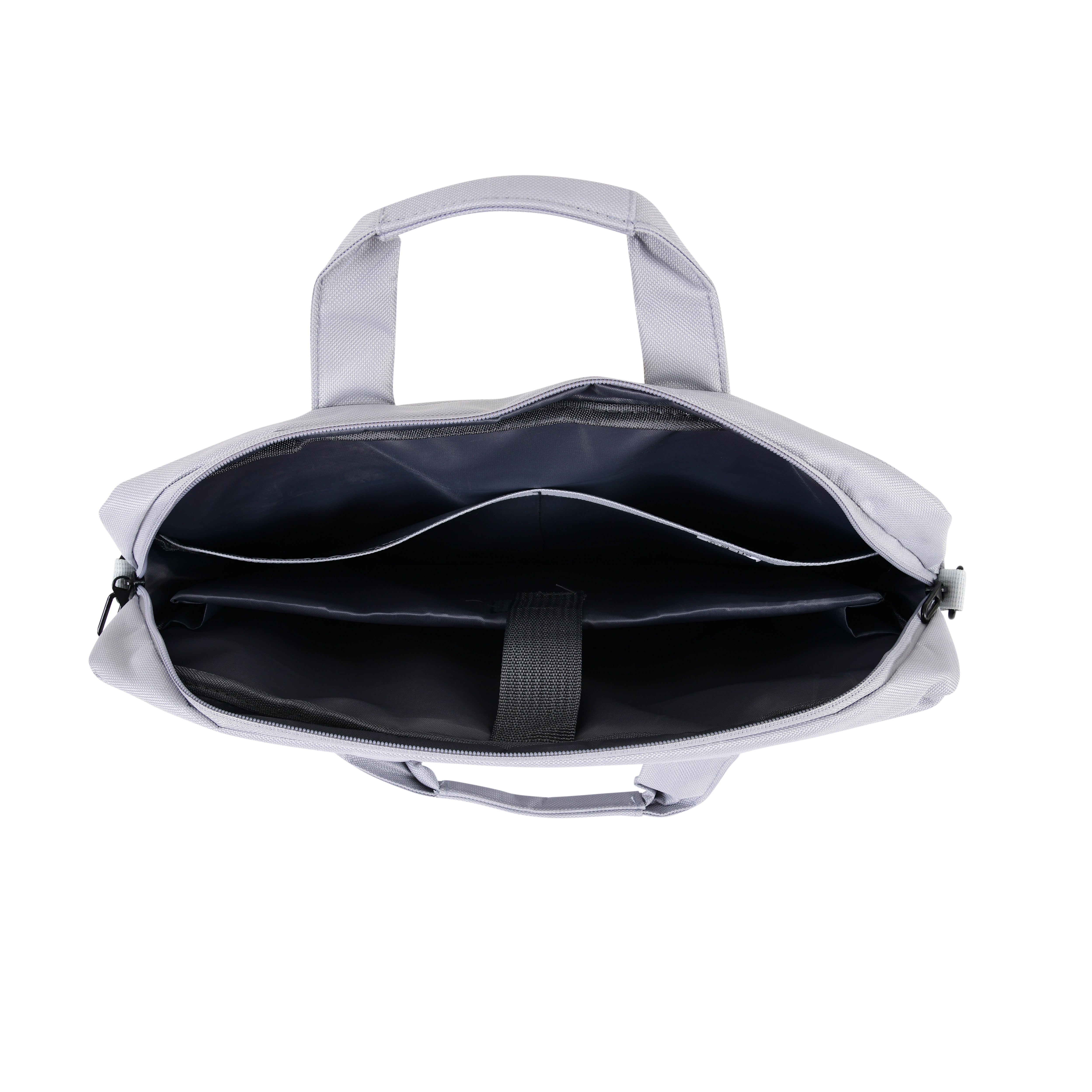 The bag includes a spacious main compartment with a padded laptop sleeve for secure protection, additional internal compartments for documents or accessories, and a front zipper pocket for quick-access items. A back trolley strap allows you to attach it to rolling luggage, while dual handles and a detachable padded shoulder strap provide carrying flexibility.