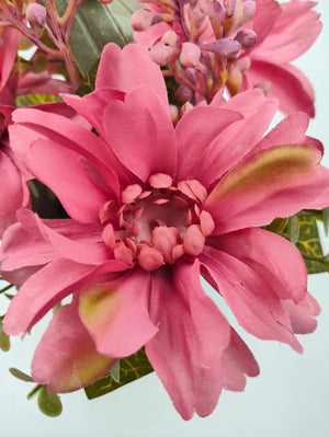 The arrangement features vibrant pink blossoms paired with green leaves and soft lavender buds, creating a cheerful yet sophisticated look. Crafted with premium-quality materials, this artificial floral arrangement maintains its fresh, lively appearance all year long without the need for sunlight or watering. Compact and versatile, it’s perfect for desks, side tables, countertops, or as a thoughtful gift for any occasion.
