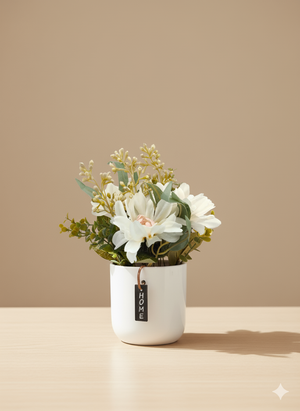 The arrangement features soft white blooms complemented by fresh green leaves and yellow buds, creating a natural, soothing look. Crafted from premium-quality materials, this maintenance-free arrangement stays vibrant and beautiful all year round without watering or sunlight. Compact yet eye-catching, it’s ideal for table tops, desks, shelves, or as a thoughtful gift for any occasion.