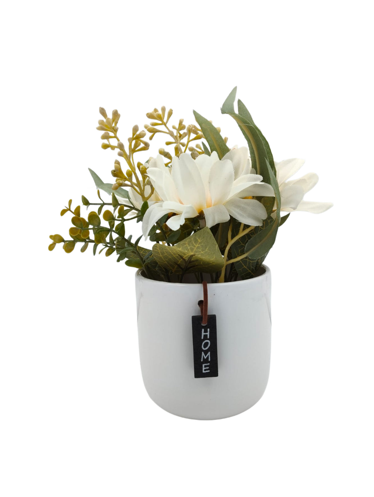 Bring a refreshing touch of simplicity and elegance to your home décor with this White Ceramic Planter featuring Artificial White Flowers and Green Foliage. The clean, glossy white ceramic pot paired with a charming “HOME” tag exudes a modern, welcoming aesthetic—perfect for brightening up any corner of your living space or office.