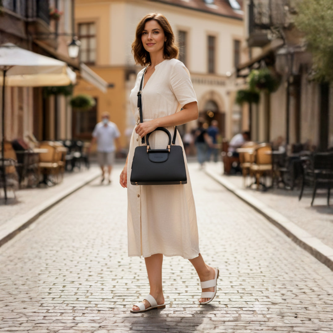 Step into elegance with this Women’s Black Handbag, crafted from premium polyurethane with a stylish textured finish. The refined beige tone is beautifully complemented by gold hardware accents, giving it a luxurious and versatile appeal. Designed with sturdy dual handles and a detachable, adjustable sling strap, it offers flexible styling as a tote or crossbody bag. Spacious and practical, the handbag includes organized compartments to keep essentials secure, making it the perfect blend of fashion and functionality.