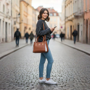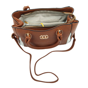 Add timeless sophistication to your collection with this Women’s Brown & White Textured Handbag, crafted from high-quality polyurethane (PU) with a fine ribbed texture that exudes elegance. The classic Brown body paired with subtle white side panels creates a striking monochrome contrast, while the polished gold detailing adds a luxurious touch. Perfectly suited for both professional and casual occasions, this handbag offers a seamless blend of style, versatility, and functionality. Designed with sturdy dual top handles and a detachable adjustable sling strap, it provides multiple carrying options—whether you prefer a chic handheld look or hands-free comfort. Its structured silhouette ensures durability and maintains its refined shape. The spacious interior with multiple compartments helps you stay organized throughout your day, making it ideal for work, outings, and special events.