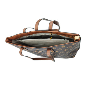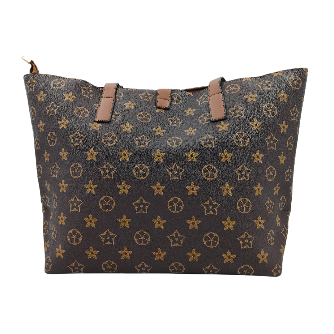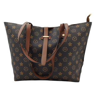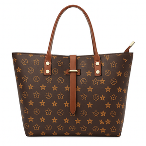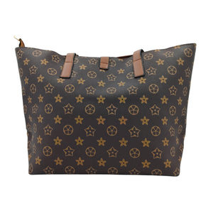 Experience elegance and versatility with this Women’s Luxury Monogram Star Tote Handbag, a statement piece that blends classic design with modern sophistication. Crafted from premium PU leather, it features an iconic all-over monogram pattern with stylish star and circle motifs, reminiscent of timeless designer aesthetics. The deep brown textured finish paired with smooth tan PU leather handles and gold-tone hardware gives it a luxurious edge that elevates any outfit.