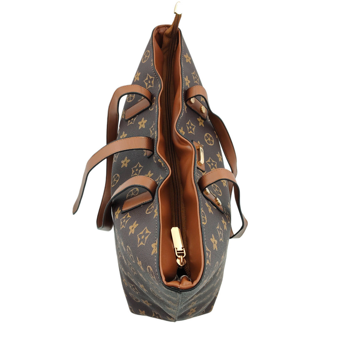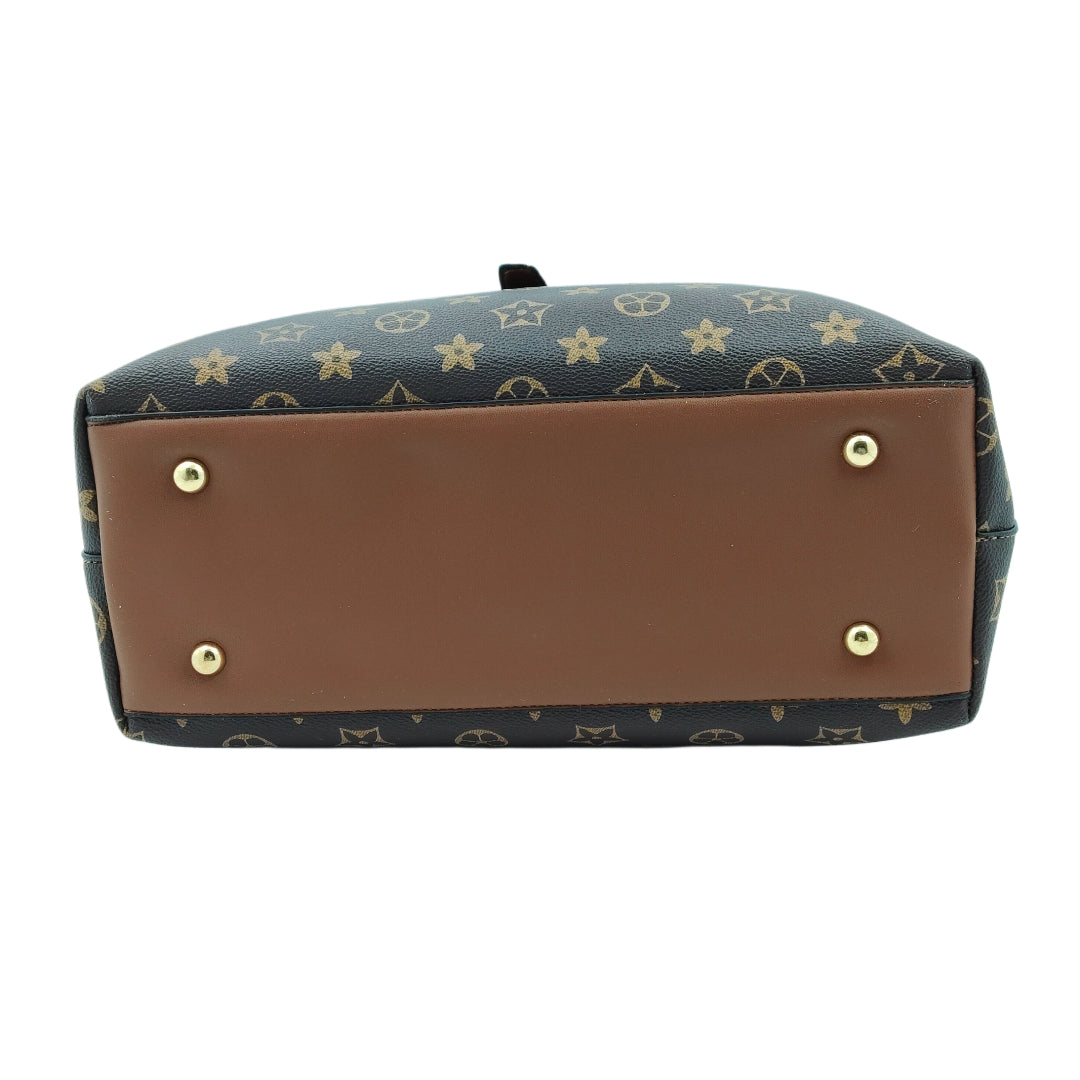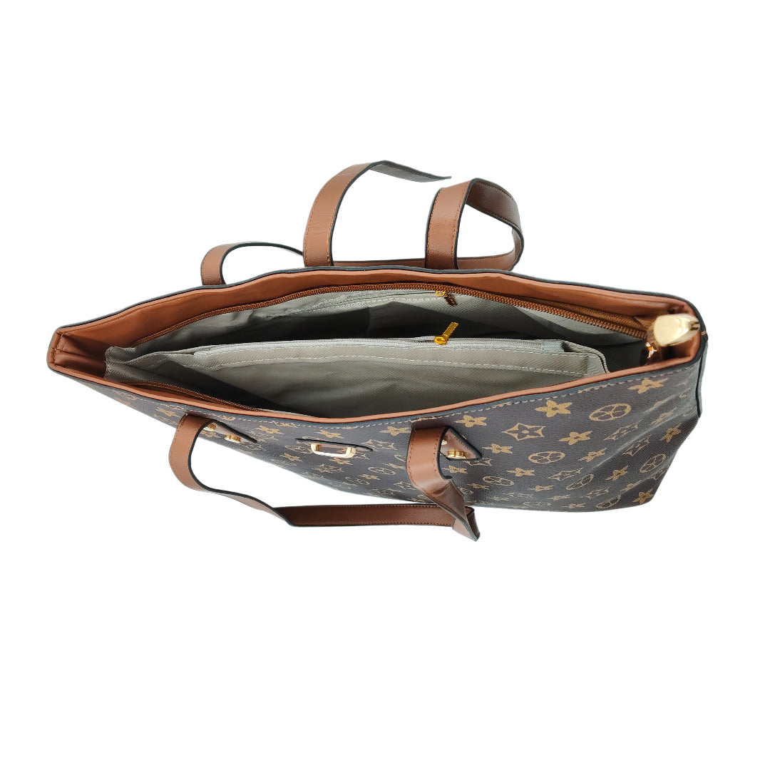 The design of this tote is inspired by the world-renowned Louis Vuitton monogram collection, reflecting its signature blend of elegance and everyday utility. With a spacious main compartment, two inner zipper pockets, and one open pocket, this handbag offers ample storage to keep your essentials organized. The reinforced PU leather base with gold studs ensures strength and stability, while the dual handles provide comfort for daily use.