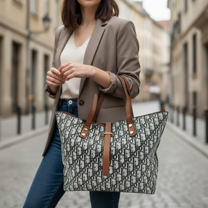 The design of this tote is inspired by the timeless elegance of Christian Dior’s signature tote style, reflecting a refined monogram aesthetic and structured silhouette. The bag opens to a large main compartment for essentials like tablets, books, or cosmetics, along with two inner zipper pockets and one open pocket for smaller valuables. The sturdy base with gold-toned metal studs provides stability and prevents wear. Designed with dual top handles and a decorative leather strap, this tote combines elegance with ease of use — ideal for work, travel, or shopping days.