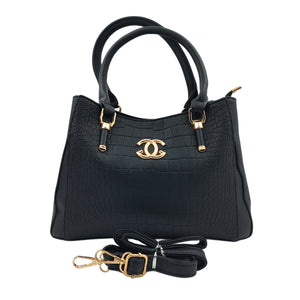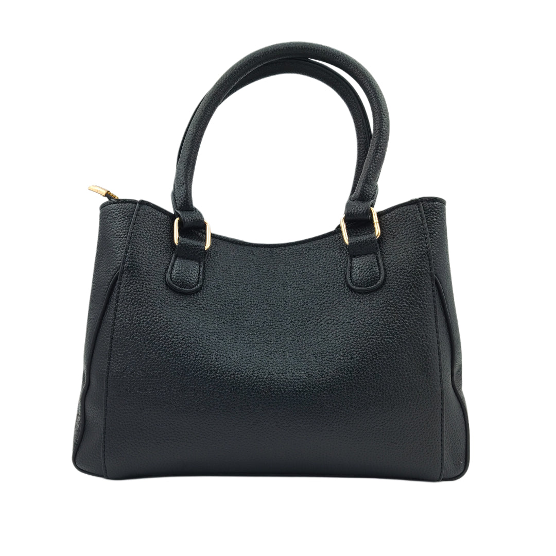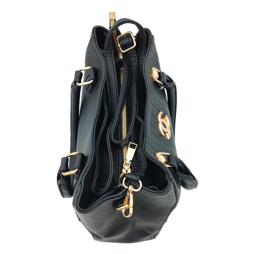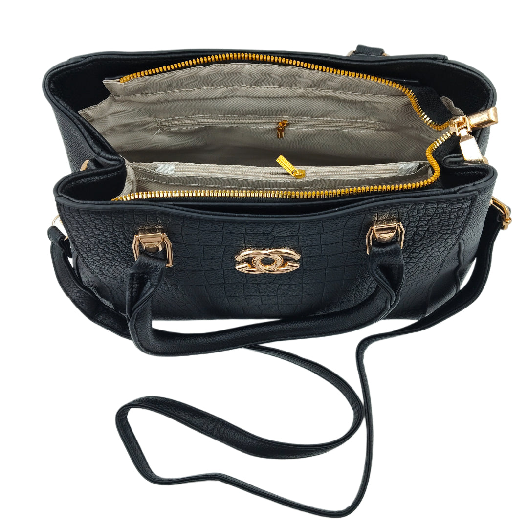 Add elegance and versatility to your collection with this Women’s Black Textured Handbag, designed with a premium leatherette finish and an eye-catching textured pattern. Enhanced with gold detailing, the bag exudes a modern yet timeless look. It features sturdy dual handles for a classic carry and a detachable sling strap for crossbody convenience. With multiple compartments and secure zipper closures, this handbag ensures your essentials stay neatly organized while elevating your everyday style.